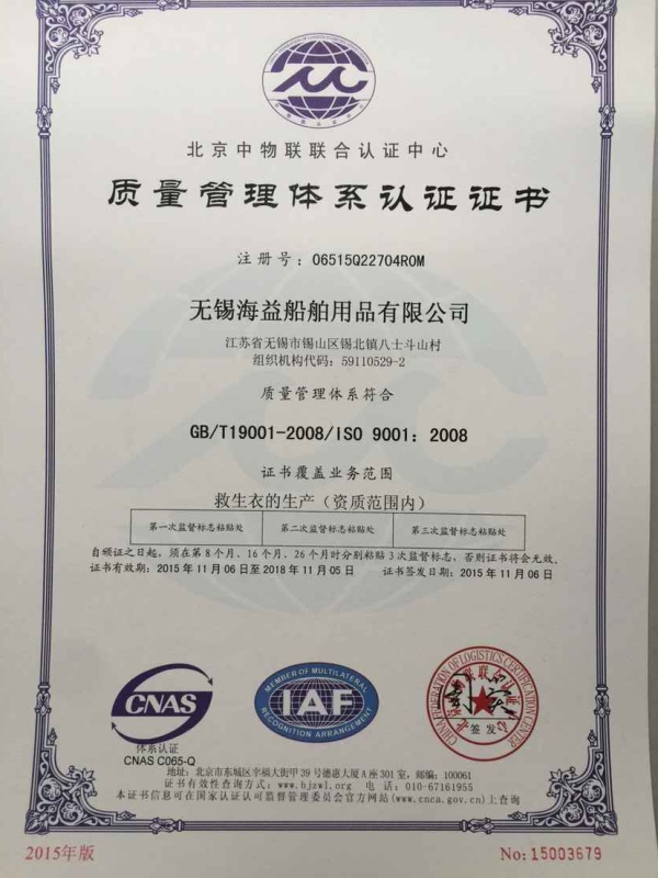 公司專業(yè)生產(chǎn)氣脹式救生衣、工作救生衣、救生圈、救生衣燈等產(chǎn)品的開發(fā)與制造;以上產(chǎn)品具有強(qiáng)度高、性能優(yōu)、體積小、重量輕、環(huán)保且簡(jiǎn)單易用等優(yōu)點(diǎn),適用于專業(yè)船用救生、軍用、也可用于休閑救生的領(lǐng)域。公司建立了完善的質(zhì)量保證體系,產(chǎn)品嚴(yán)格按照SOLAS、LSA、Code和ISO12402等最新的國(guó) 際規(guī)范要求進(jìn)行研制、試驗(yàn)、生產(chǎn)和檢驗(yàn)。